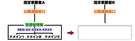 - この手続きを行う事で、その登録者情報、その登録者情報に関連付けられている全てのドメイン名、そのドメイン名を持つネームサーバホスト情報が、変更先指定事業者に変更となります。