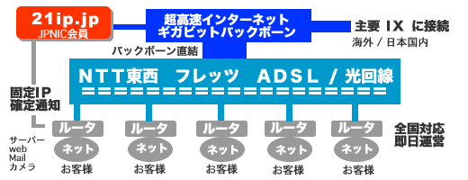 個人様のインターネット接続からオフィスでビジネスを目的とするサーバー運営まで幅広く対応します。Web,Mailサーバー運営をはじめ、Webカメラの遠隔操作、情報家電操作、VPN構築等にご利用ください。