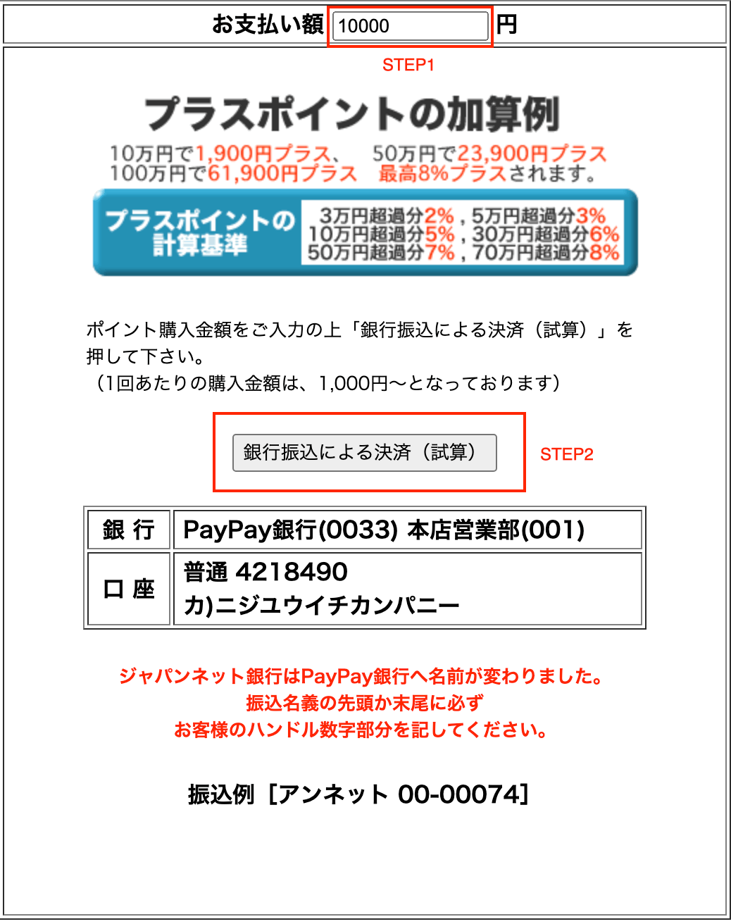 お申し込みいただいた金額を金融機関からお振り込みください。 送金の際にはお振込様名とハンドル番号をご記入下さい。 (例:ヒロシマタロウ 00-xxxxx ) ※振り込みに伴う手数料はお客さまの方で御負担ください。