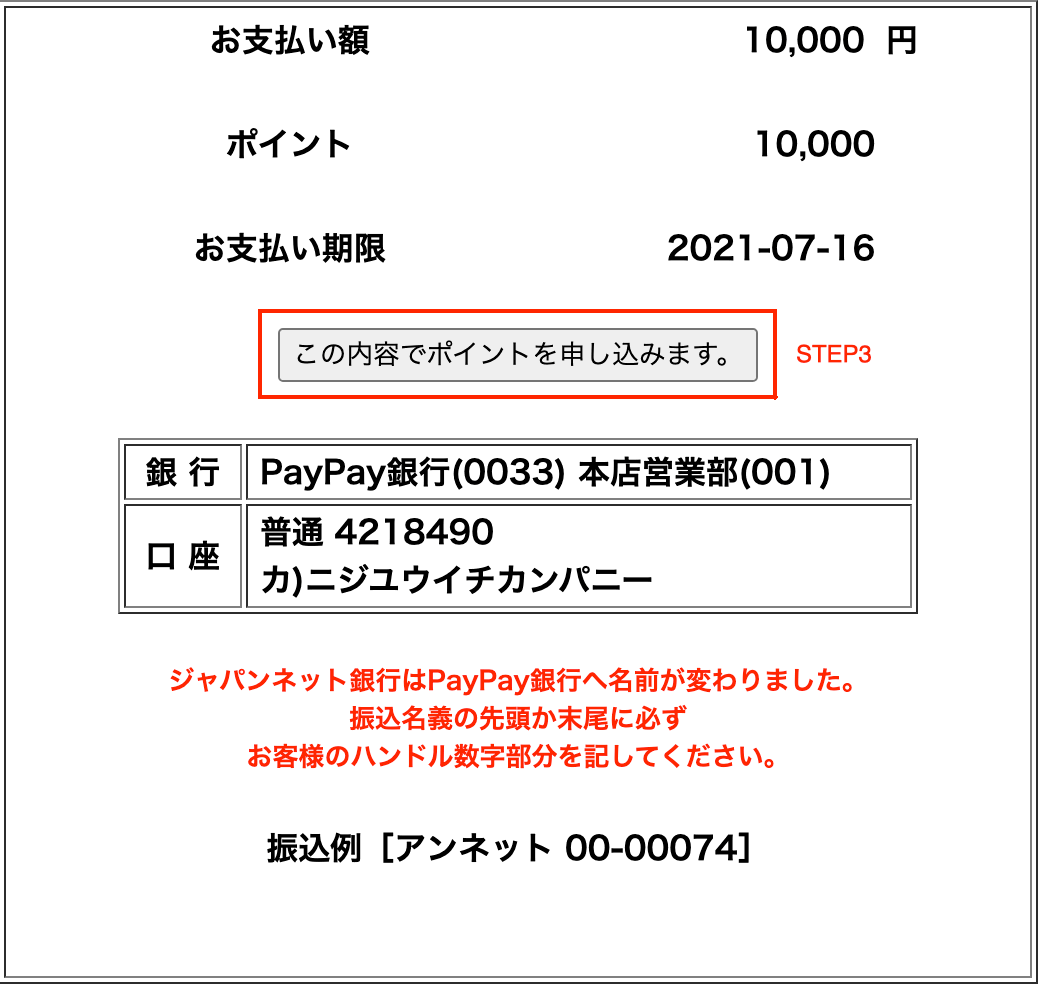 続いて確認画面が表示されます。 ご希望金額とプラスポイントにお間違いがなければ、「この内容でポイントを申し込みます。」ボタンを押して下さい。